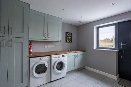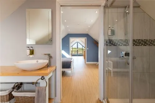A bespoke oak staircase takes you up the first-floor landing with a seating area and two comfortable sofas. The cinema room is found on the first floor which features a projector, Bose sound systems and ultra-comfortable reclining cinema seats. There are two further bedrooms on the first floor: a king-size bedroom with en-suite bathroom with a large walk-in shower, freestanding bath, sink and toilet. A further twin bedroom, furnished with a zip link bed (which can be made into a king at time of booking). There is an en-suite shower room also with a sink and toilet. All of the upstairs rooms feature skylight windows with lovely views.
