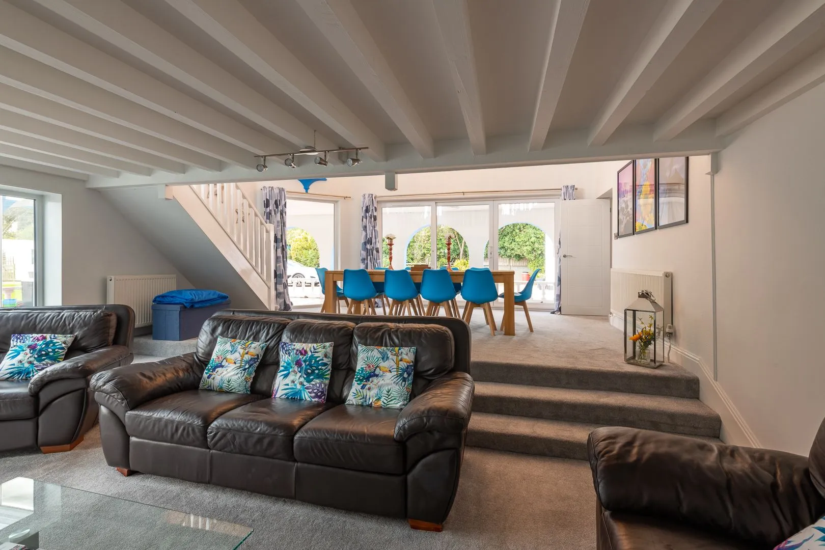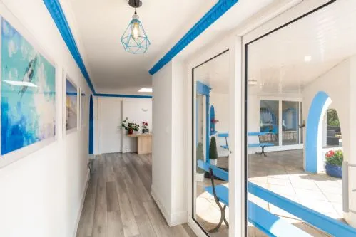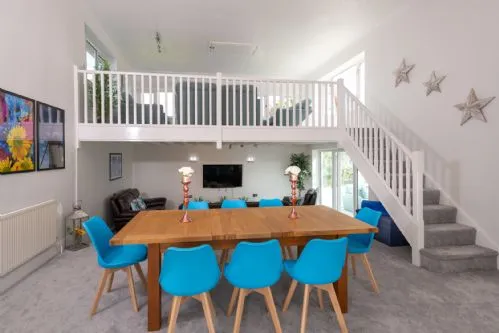As you enter Coed y Llan you feel you’re in a mediterranean villa, the hallway splits off into three directions. To the right is the first super-king en-suite bedroom, and the beautifully spacious open-plan living area with a ground floor sunken den, separate dining area, and upper-level mezzanine snug. Patio doors on either side lead to the veranda and a sunny conservatory with two comfy sofas. The mezzanine snug offers heavenly views across the dunes to the sea. A guest cloak toilet is located in the impressive hallway. Off to the left is the fully equipped kitchen, which has ample space for meal preparation and includes a breakfast bar. Patio doors from the kitchen open to an enclosed courtyard, perfect for morning coffee and breakfast in the sun. A further super-king en-suite bedroom is also found down here. Heading straight on in the hallway you will find the family bathroom, twin bedroom, double bedroom and the third and final super-king en-suite bedroom (note: this is down three or so steps)