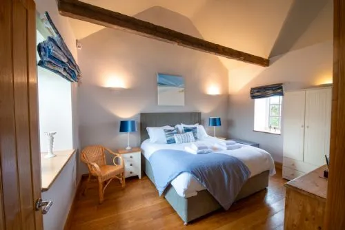 There's a large sitting room with a log-burning fire off the kitchen, to help you feel cosy after a day of exploring. On warm evenings, open the French windows and dine al fresco under the starry skies. No. 9 The Dairy has two bedrooms, The super king bedroom with en-suite wet room offers a refreshing shower experience with constant hot water. Alternatively, soak in the family bathroom's tub for a relaxing end to your day. Crisp linens and cosy duvets ensure a restful night's sleep in the countryside's peace and quiet. Next door, the twin bedroom (that can be converted into a super king) is perfect for children, who will drift into dreams of building magnificent sandcastles and flying kites under blue skies.