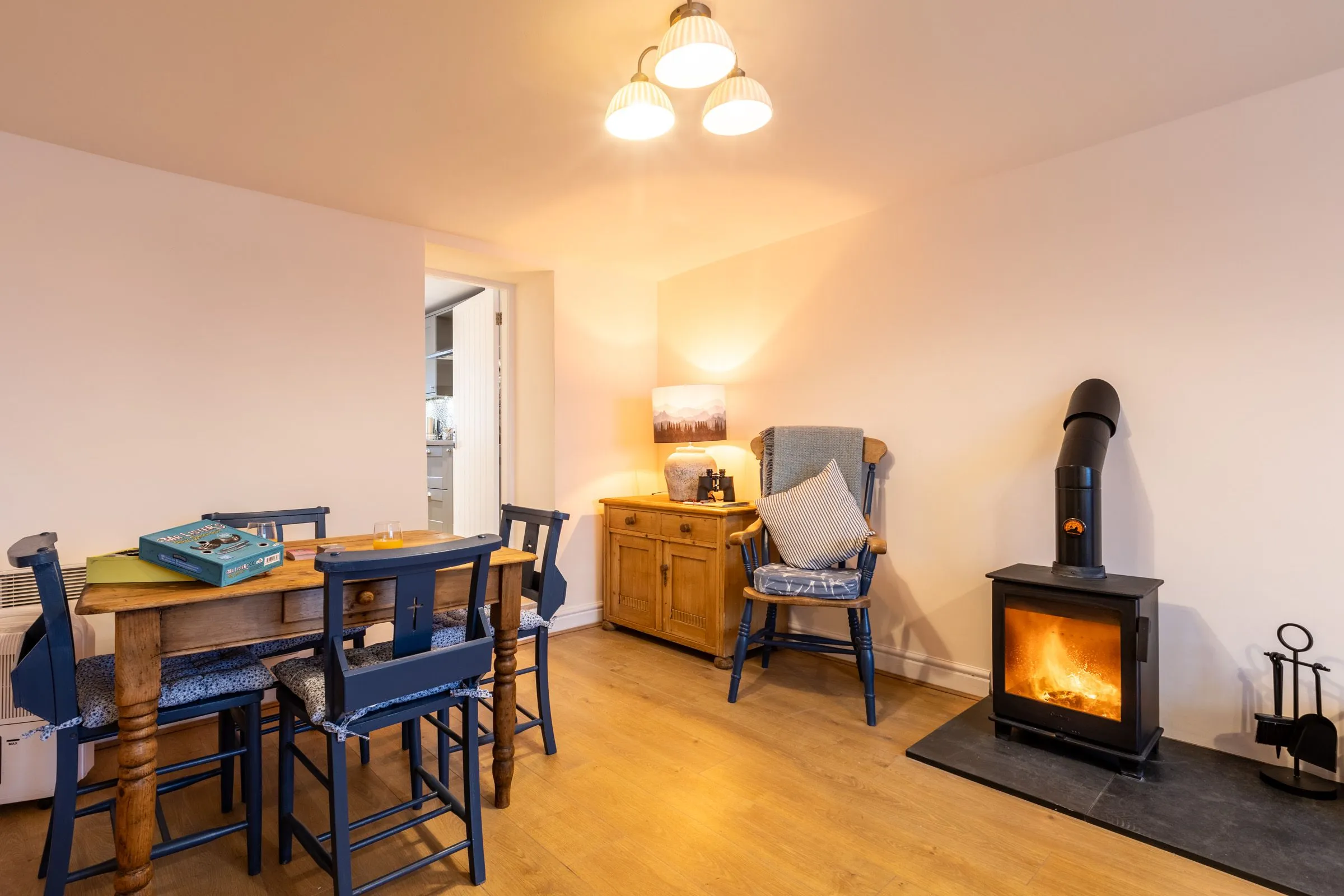 Inside, the cottage is snug and welcoming. The lounge/diner features a comfy sofa, a wood-burning stove for chilly evenings, and a window seat ideal for slow mornings with a cuppa and a good book. There’s a dining table for planning your day’s adventures, plus blankets tucked away in trunks and a selection of books and games for relaxed nights in.
