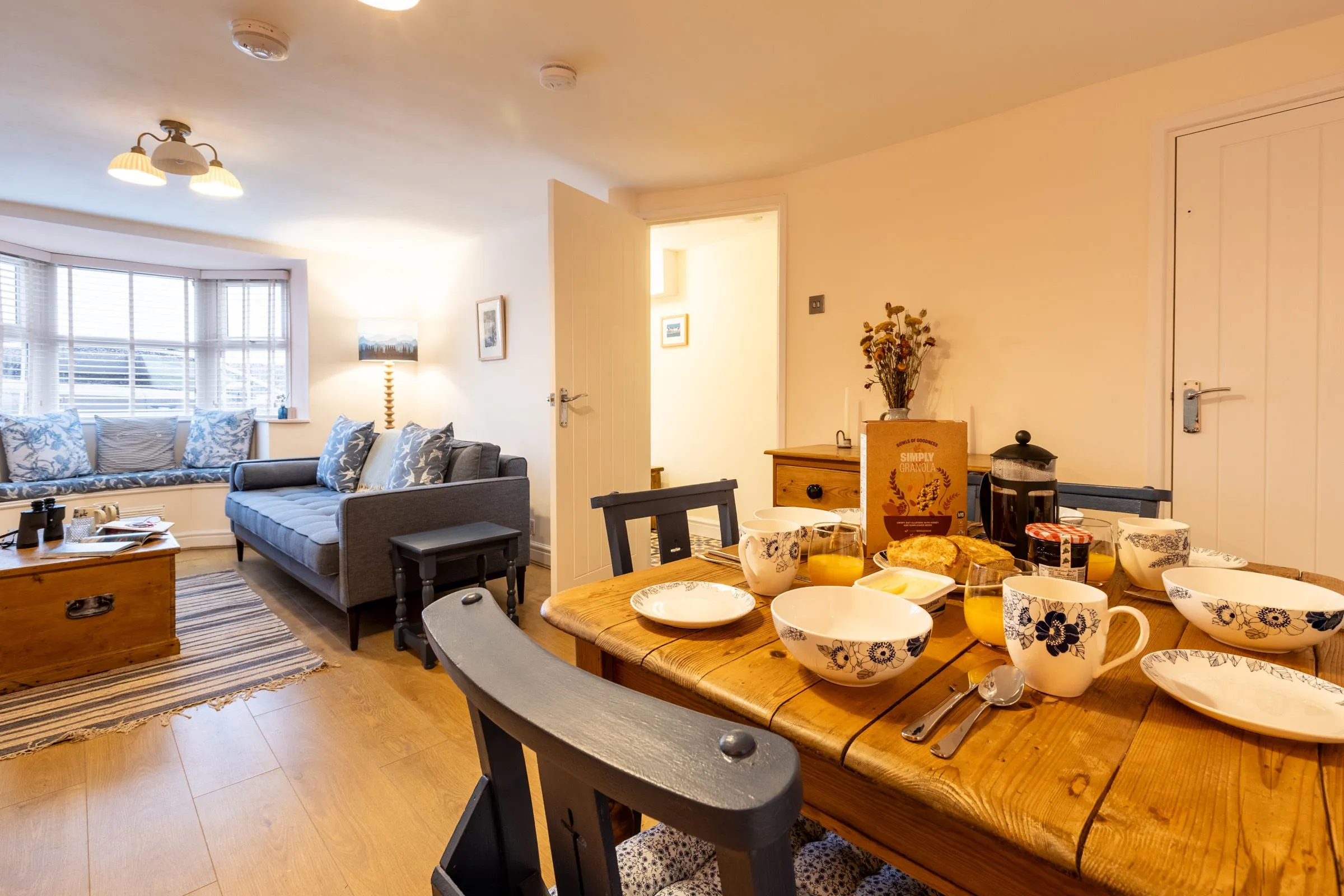 The kitchen is well-equipped for easy meals and opens out to an enclosed patio, perfect for morning coffees, safe playtime, or letting the dog stretch their legs. Guests can park directly outside the cottage, with additional spaces available nearby.