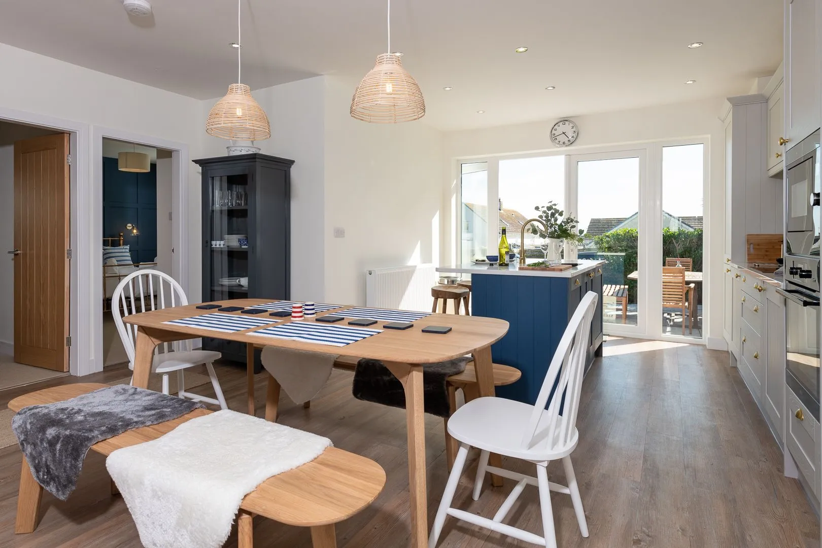 Between the living area and the kitchen, a large dining table comfortably seats eight guests. The kitchen is fully equipped with everything you need to prepare meals for the whole family. Gather around the kitchen island with stools to prep pizzas, BBQ dishes, or beach picnics. The kitchen opens out to an enclosed patio and garden area with a charcoal BBQ and a dining table for al fresco dining on warm summer evenings.