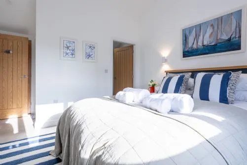Step inside the front door and you'll be greeted by a huge open-plan living, dining, and kitchen space on the ground floor. The living area has beautiful interiors, coastal tones, three comfy sofas, and a large wall mounted TV with sliding doors leading out to the front patio area. The fully equipped kitchen is a cook’s dream, boasting four electric ovens, an induction hob, two integrated fridges and freezers, and a large island - perfect for meal prep or socialising. Another feature is the dedicated coffee cupboard, complete with a Nespresso machine, making mornings a little more special.
