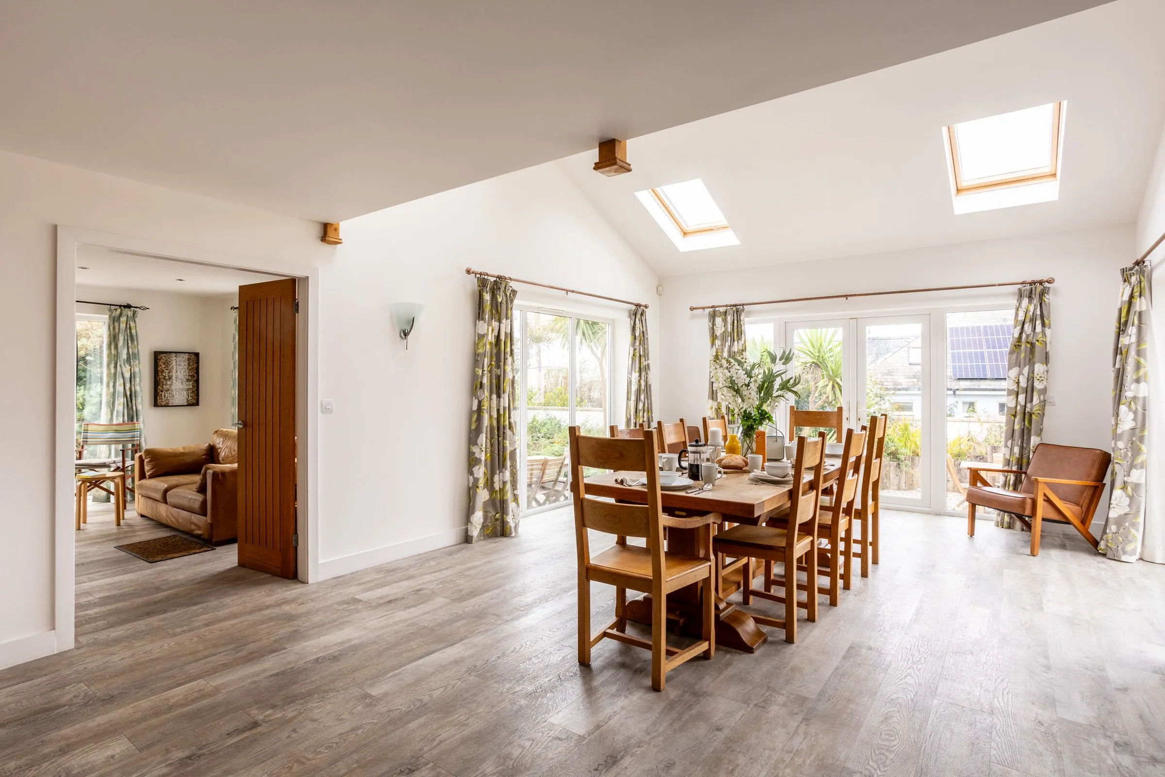 Ty Traeth (pronounced 'Tea Try-th') greets you with an impressive central dining area featuring a vaulted ceiling, overhead gallery, and patio doors on three sides. This creates a space that merges indoor and outdoor living. The sitting room, with its L-shaped sofa and wood burner, is perfect for relaxing or movie nights. The fully equipped kitchen has ample work surfaces, a dining table, and a sofa, making it an ideal space for cooking, chatting, whilst cooking up a storm. The kitchen also opens onto a terrace for dining. On the ground floor, there is also a twin bedroom and a guest toilet.